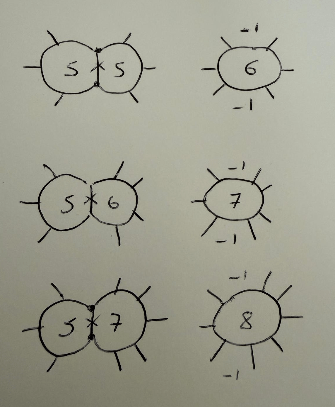 By removing an edge between an F5 face and a Fn face, you obtain an F(n+1) face. The two adjacent faces that shared the removed vertices each lose one edge. If the two adjacent faces are actually the same face, the number of edges decreases by two.